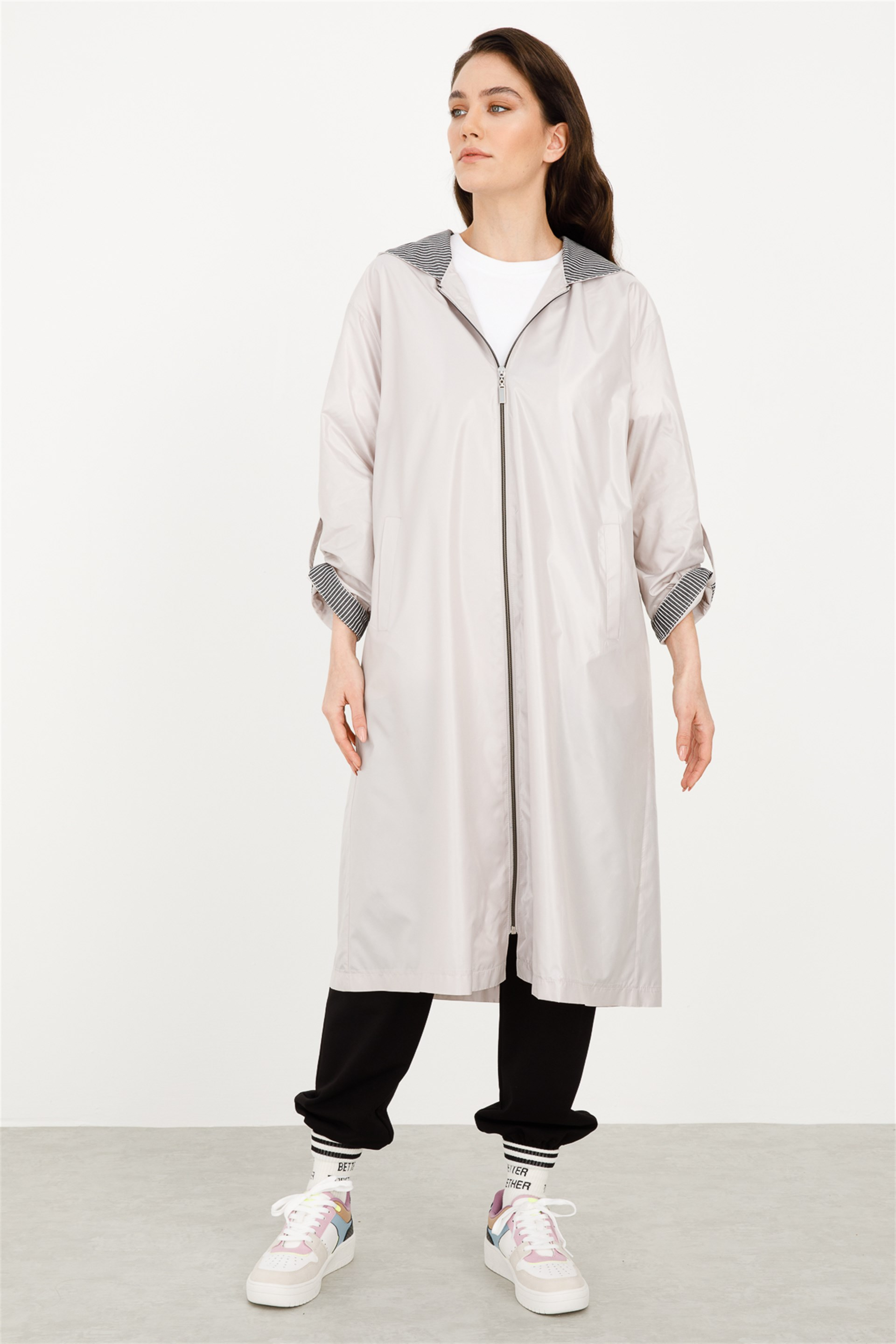 Rüzgar Geçirmez ve Su Tutmaz Fonksiyonel Kumaştan Spor Boy Kap (110 cm) Sabit pamuk çizgili kumaştan kapüşonlu, önü fermuarlı, astarsız. Daha fazla hareket olanağı sağlayan konforlu, klasik, vazgeçilmez ve zamansız kap sizi rüzgardan koruyacak ve hafif yağışlı havalarda kuru kalmanızı sağlayacak şekilde tasarlanmıştır. * Beden seçimi yapmadan önce lütfen bedenler üzerinde yer alan renk kutucuklarına tıklamayı unutmayınız! Üretim Ülkesi: Türkiye Sezon: 2021 İlkbahar Yaz Kumaş İçeriği: %100 Polyester Boy Uzunluğu: 110 cm Manken Ölçüleri Giydiği Beden: 38 Boy: 176 cm Göğüs: 88 cm , Bel: 66 cm , Basen: 99 cm