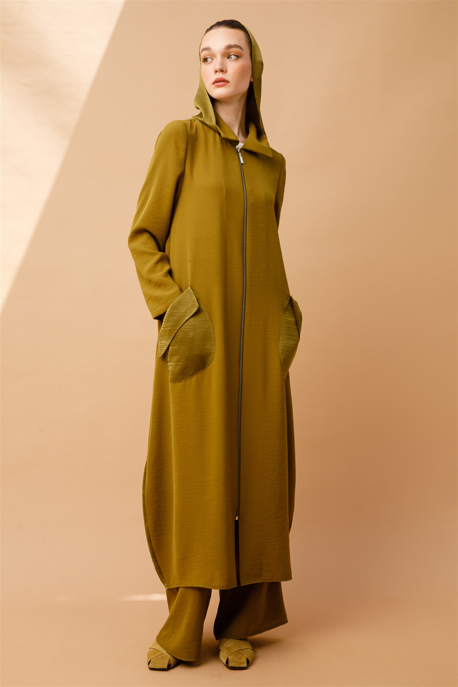 Saten Kapüşonlu ve Cep Detaylı Sade ve Spor Tam Boy Kap-Haki (221595M PARDESÜ-20)