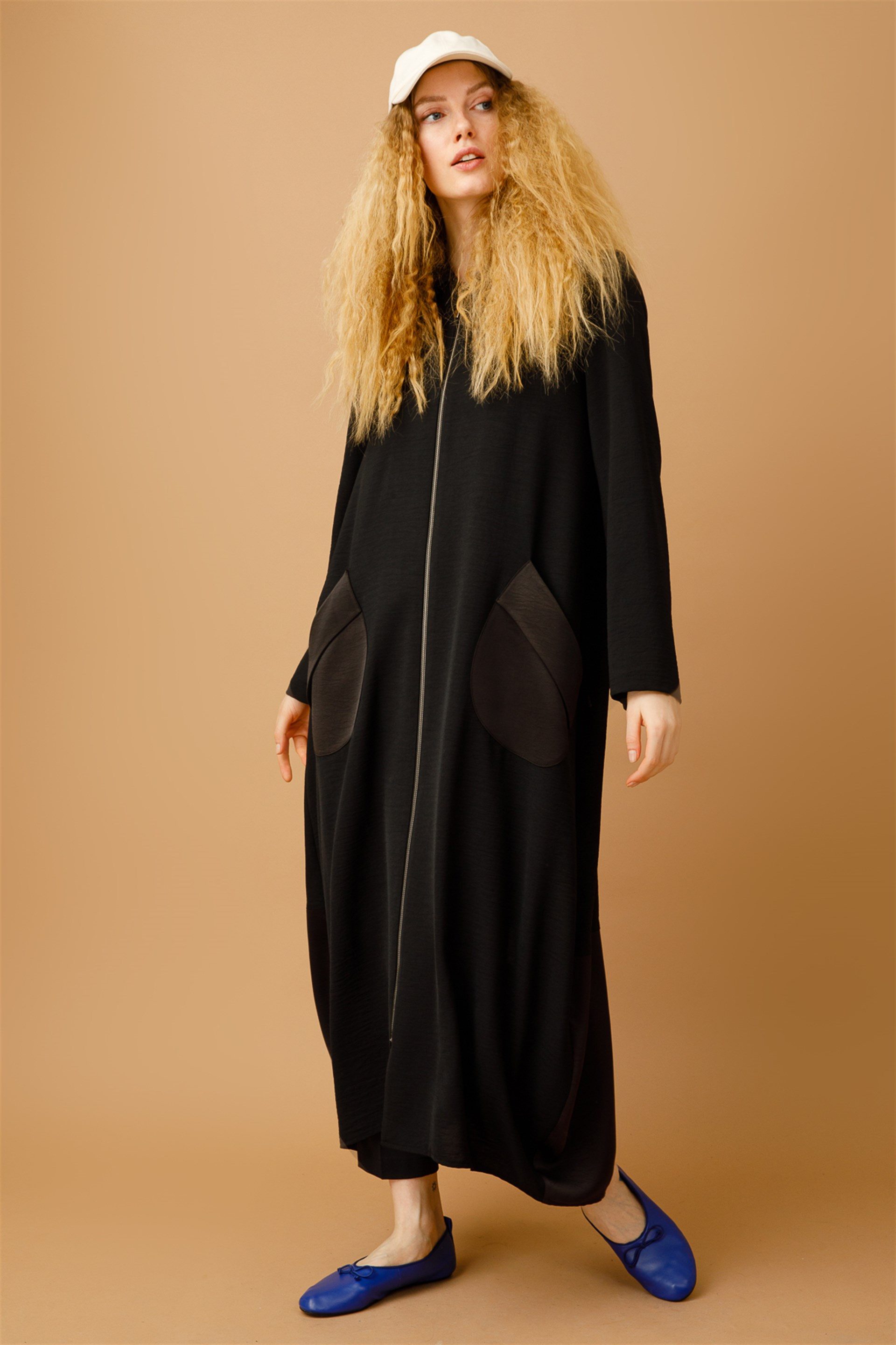 Saten Kapüşonlu ve Cep Detaylı Sade ve Spor Tam Boy Kap-Siyah (221595M PARDESÜ-01)
