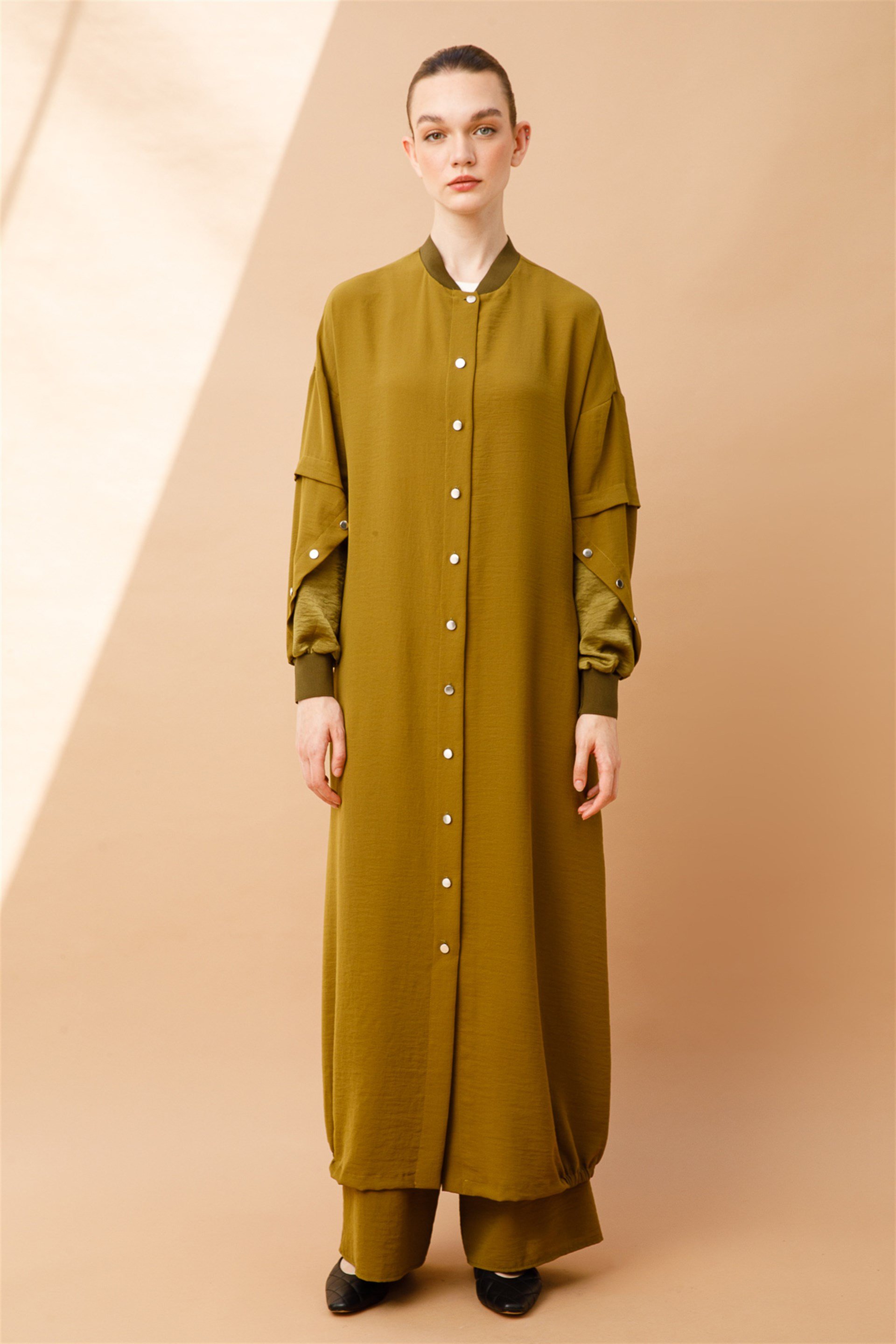 Saten Kol Detaylı Tam Boy Zor Kırışan Nefes Alan Kumaştan Spor Kap-Haki