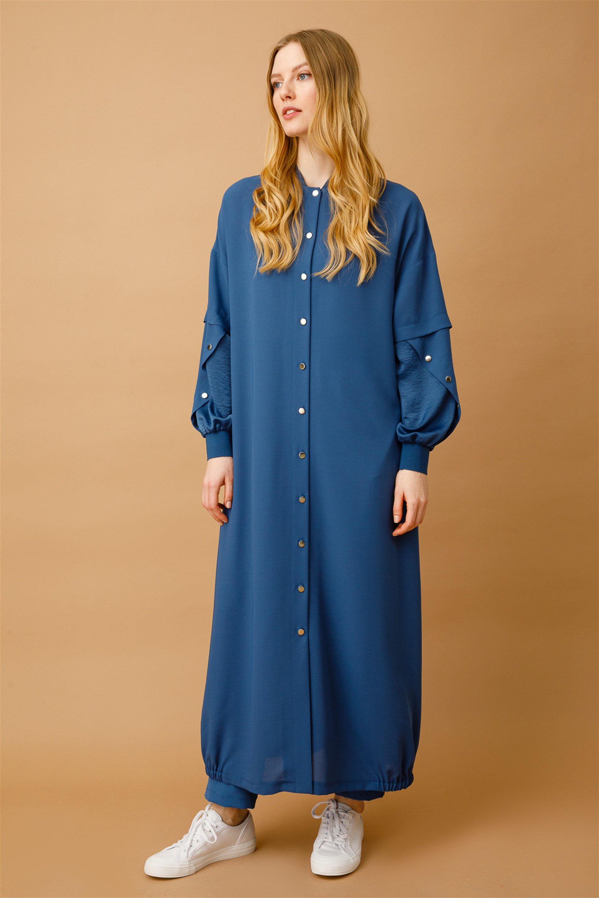Saten Kol Detaylı Tam Boy Zor Kırışan Nefes Alan Kumaştan Spor Kap-İndigo (221815M PARDESÜ-44)