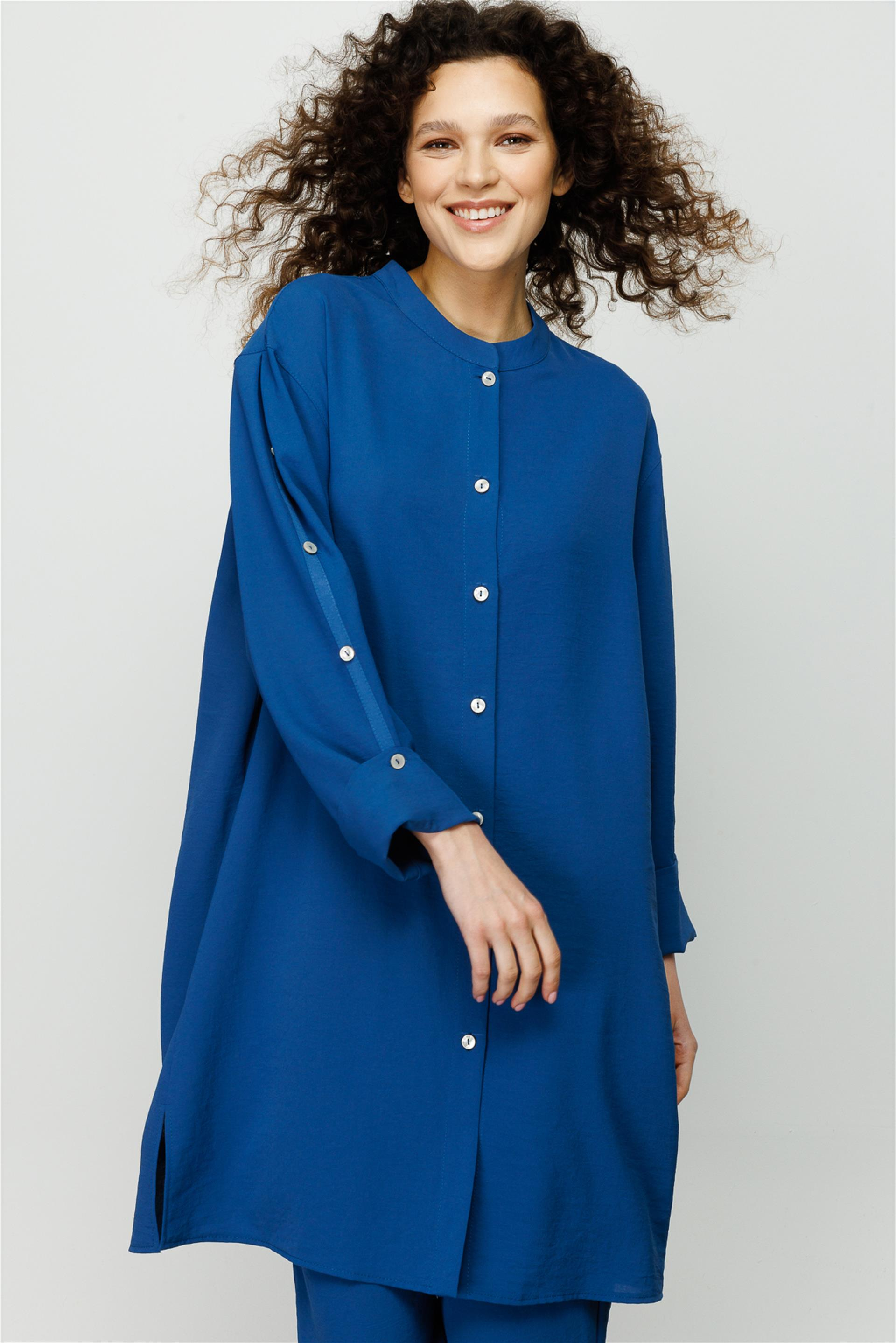 Sedef Düğme Detaylı Zor Kırışan Nefes Alan Kumaştan Basen Örten Takım-İndigo (231803M SEDEFLİ TAKIM-44)