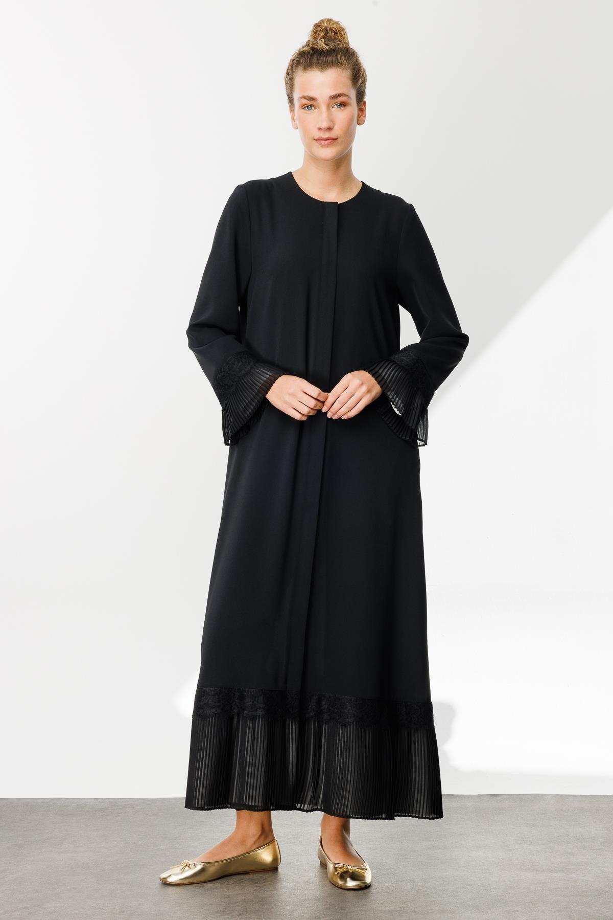 Shiil Şifon ve Extra Pilise Detaylı Özel Dokuma Zor Kırışan Nefes Alan Ferace Kap-Siyah