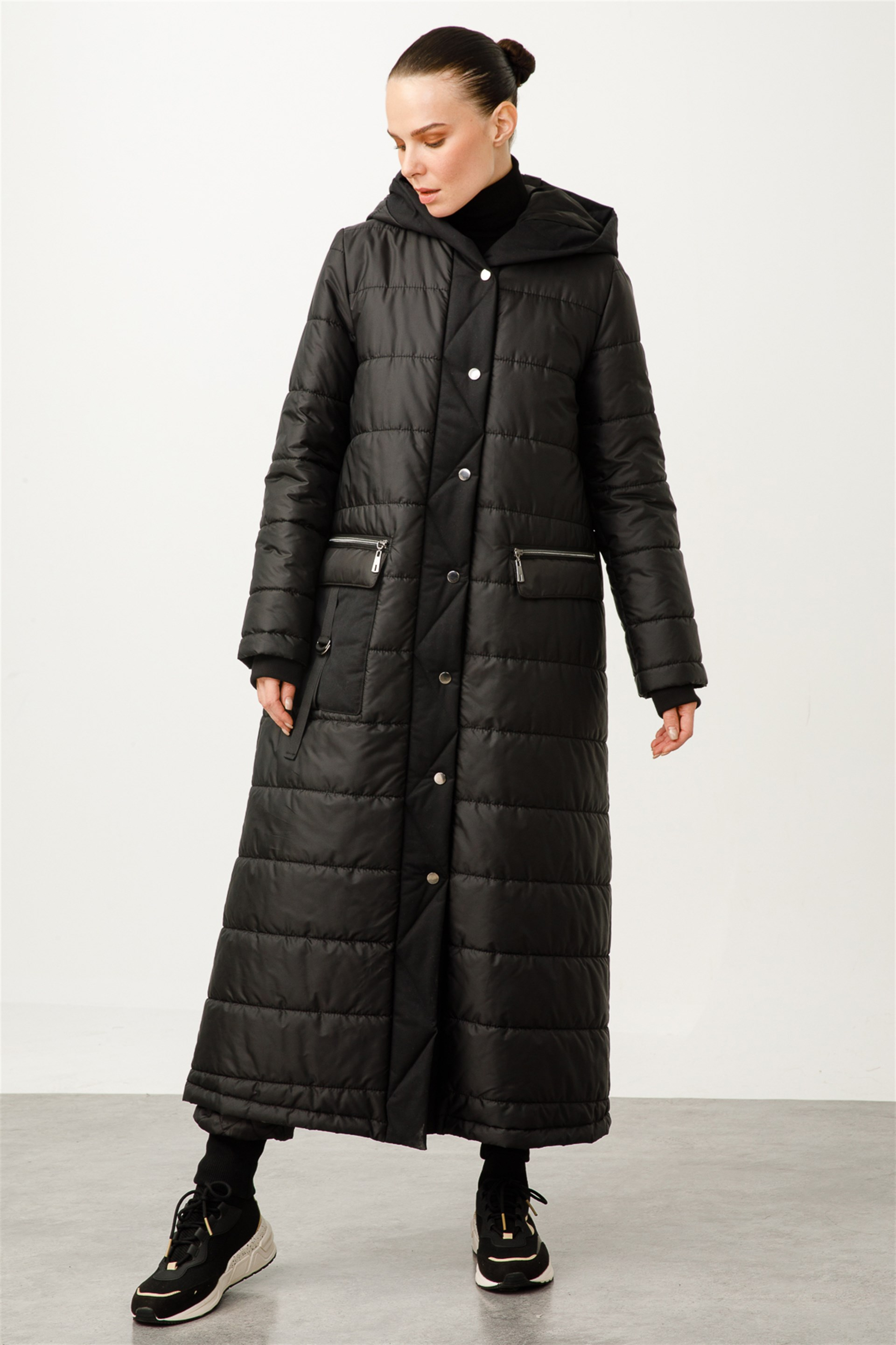 Şişme Elyaf Dolgulu Helene Garnili Spor Detaylı Manto-Siyah (222523M KABAN-01)