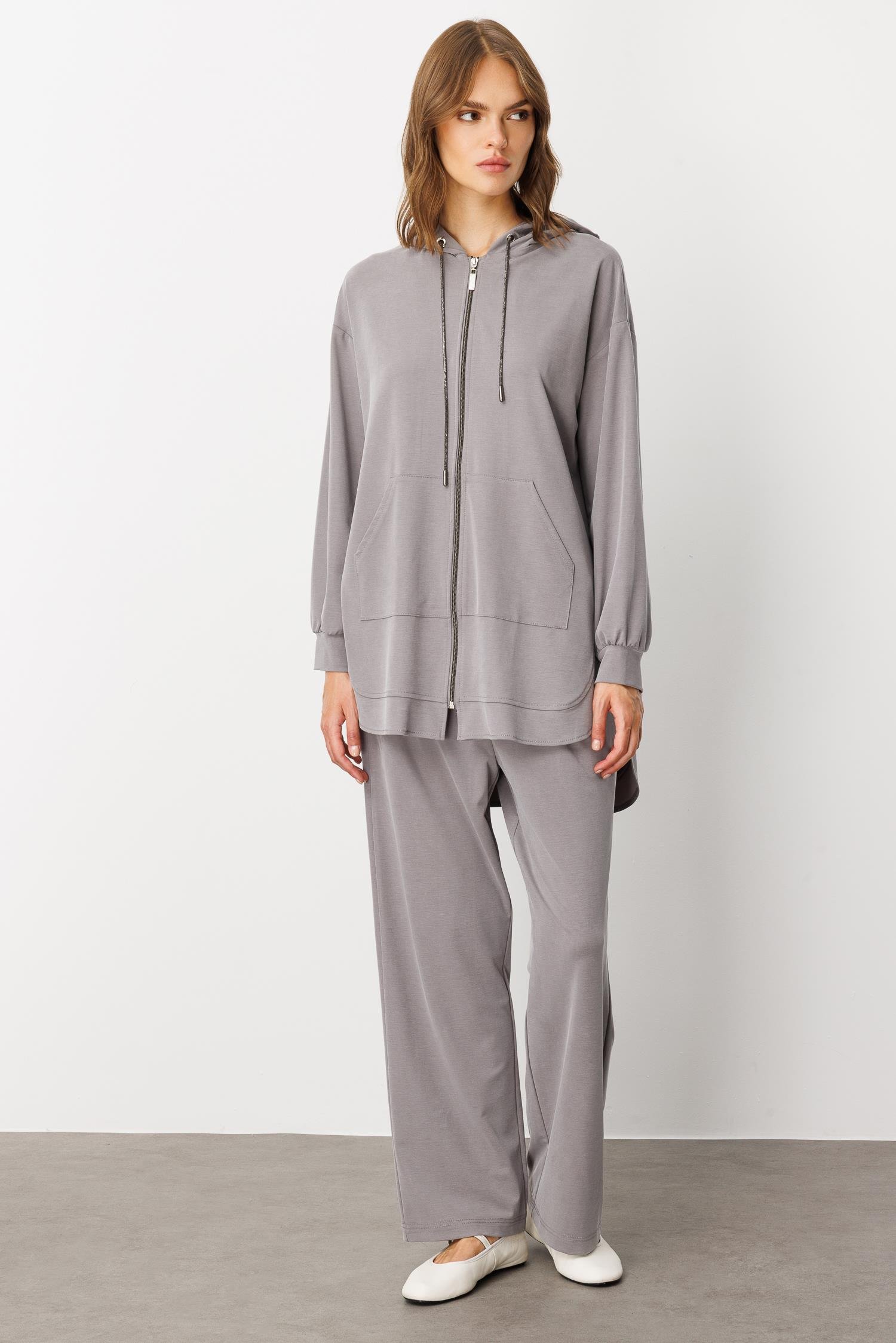 Soft Örme (miccell %55 doğal içerik) Elişi Detaylı Pantalon Kombin Takım-Gri (252833M PANTOLONLU KOMBİN-18)