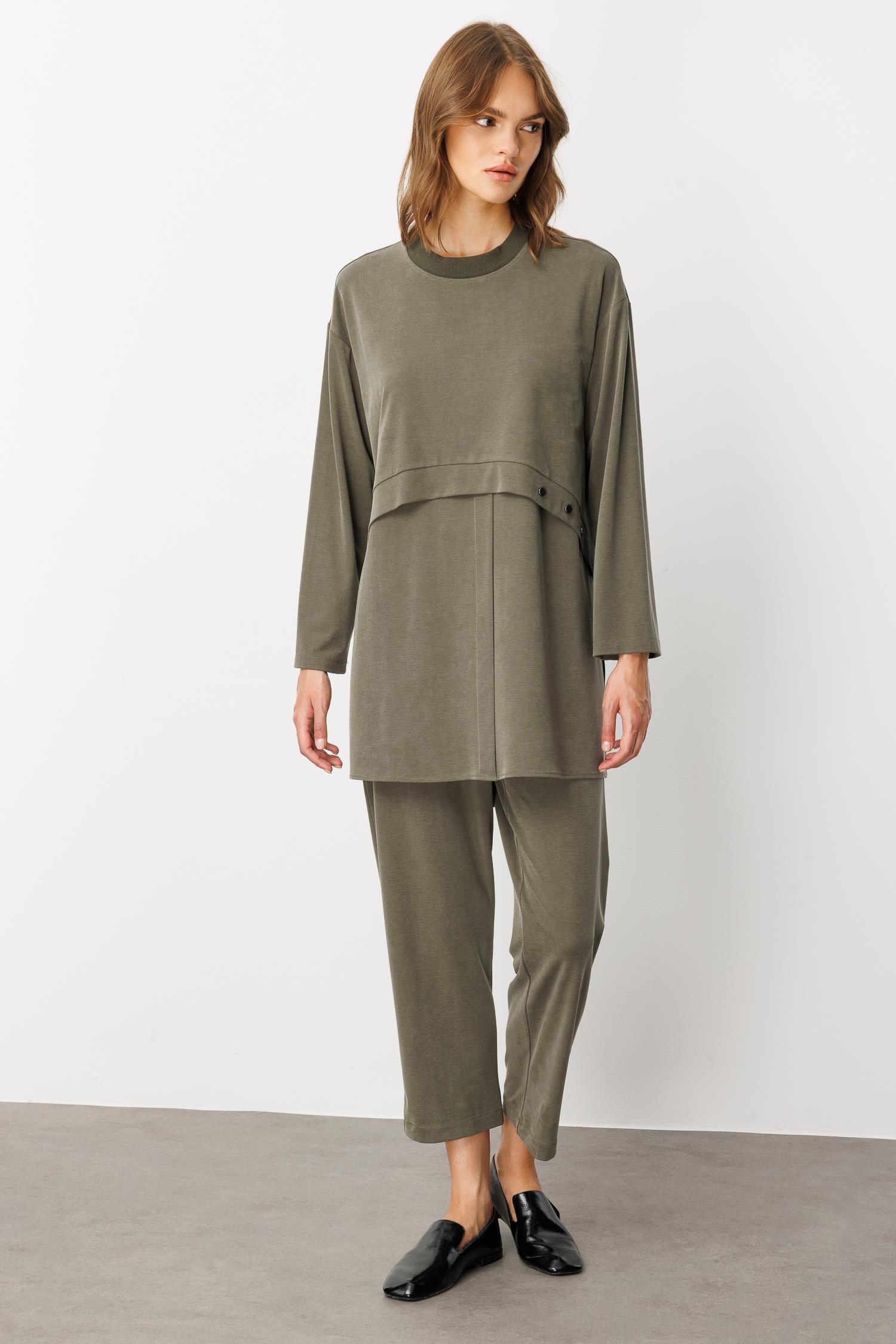 Soft Örme (miccell %55 doğal içerik) Elişi Detaylı Pantalon Kombin Takım-Haki (252852M PANTOLONLU KOMBİN-20)