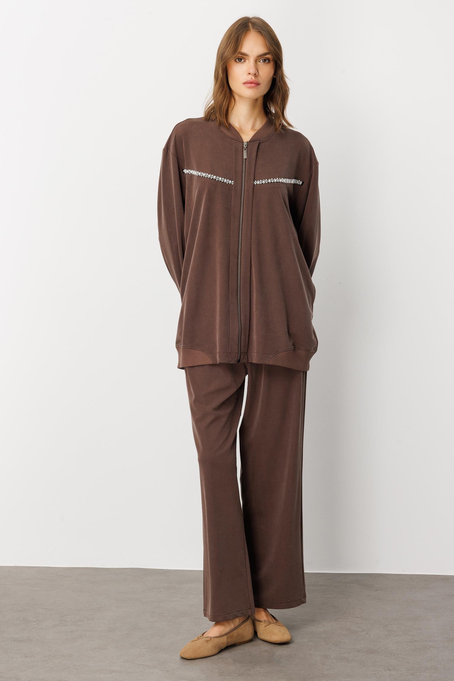 Soft Örme (miccell %55 doğal içerik) Elişi Detaylı Pantalon Kombin Takım-Kahve (252834M PANTOLONLU KOMBİN-02)