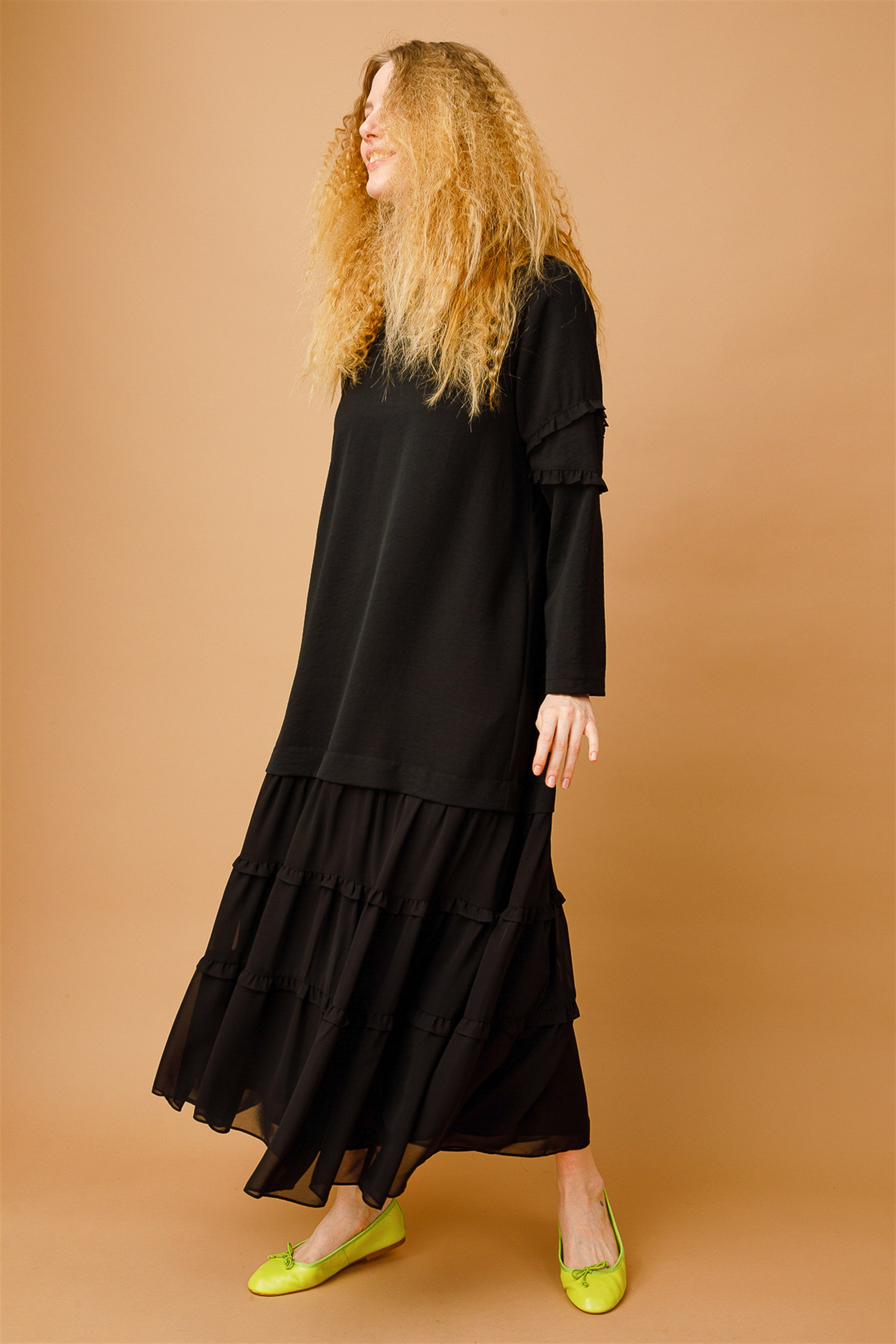 Soho Altı Şifon Kat Kat Fırfırlı Tam Boy Elbise-Siyah