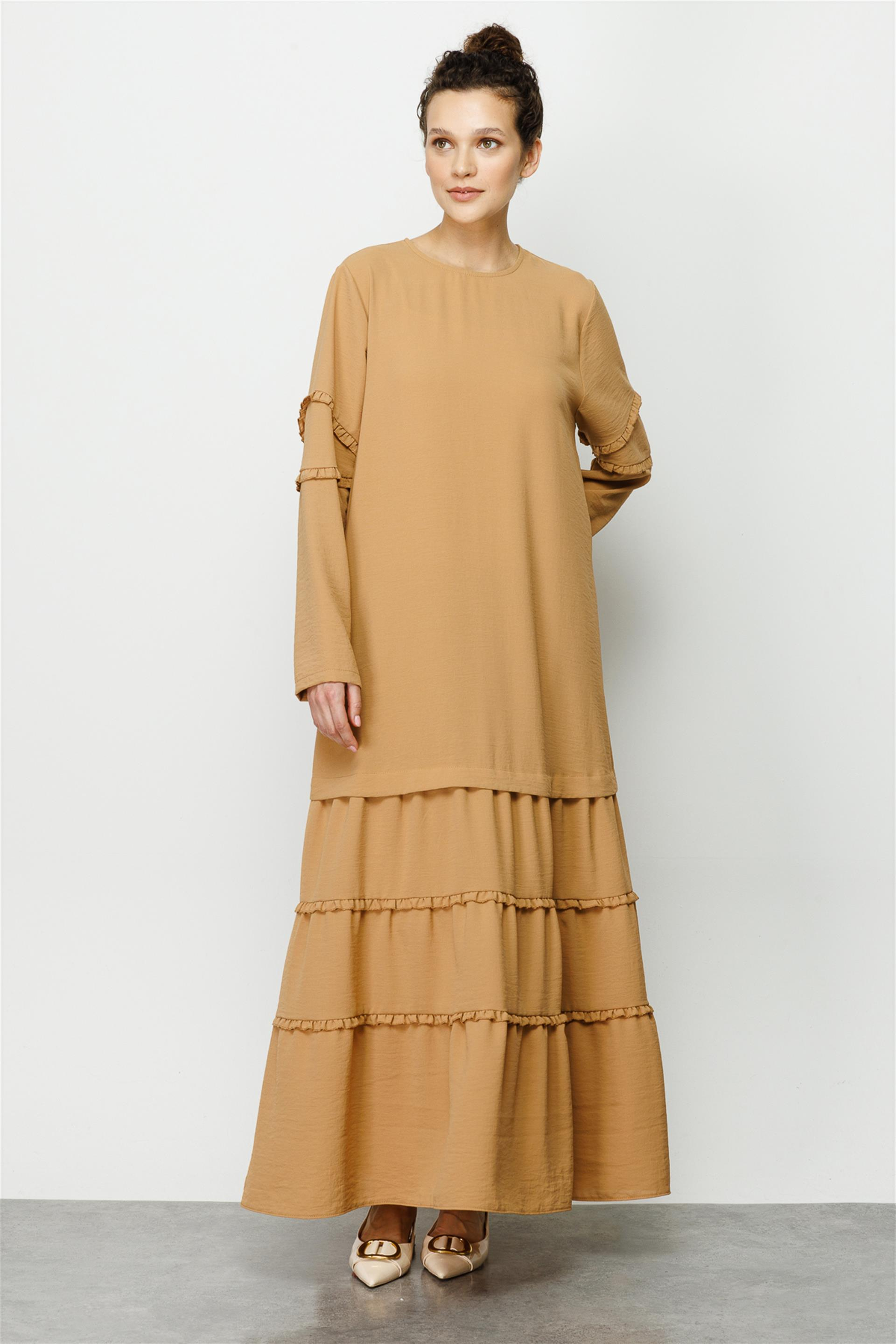 Spanje Zor Kırışan Nefes Alan Kumaş Zamansız Elbise-Camel (231335M SPANJ ELBİSE-08)