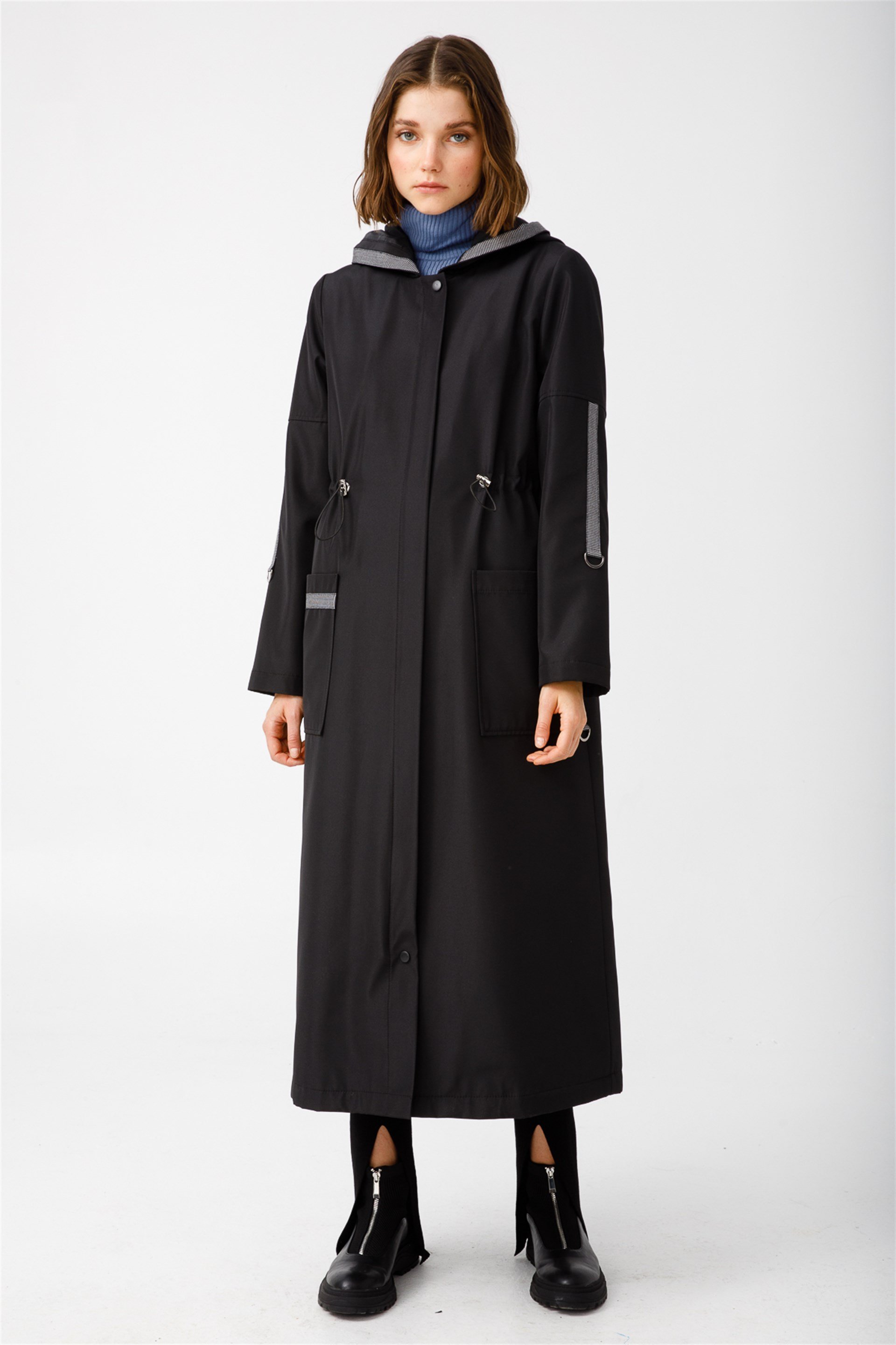 Spor Aksesuar Detaylı İçi Peluş Astarlı ve Dolgulu Uzun Manto-Siyah (212546M KABAN-01)
