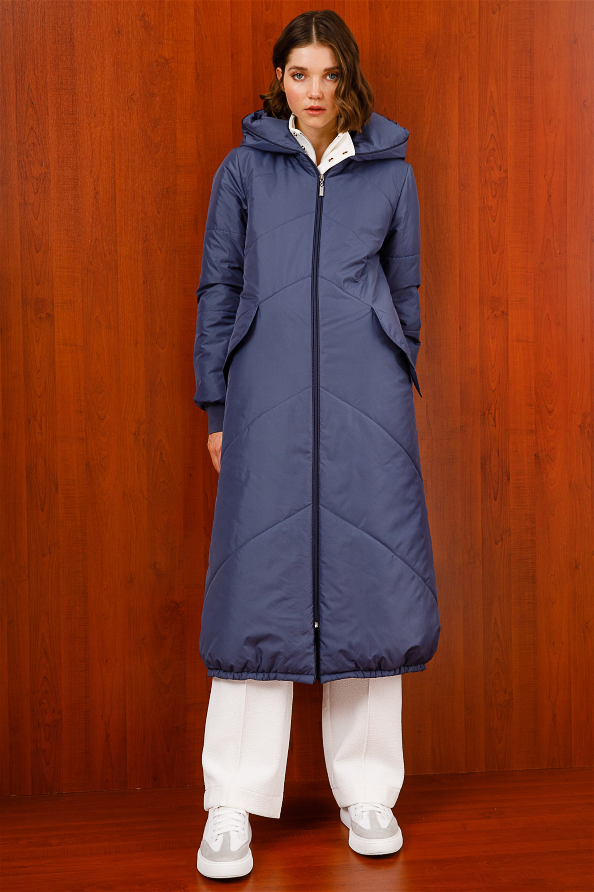 Sportif Biye Detaylı Dokuma Şişme Tam Boy Manto-İndigo (212537M KABAN-44)
