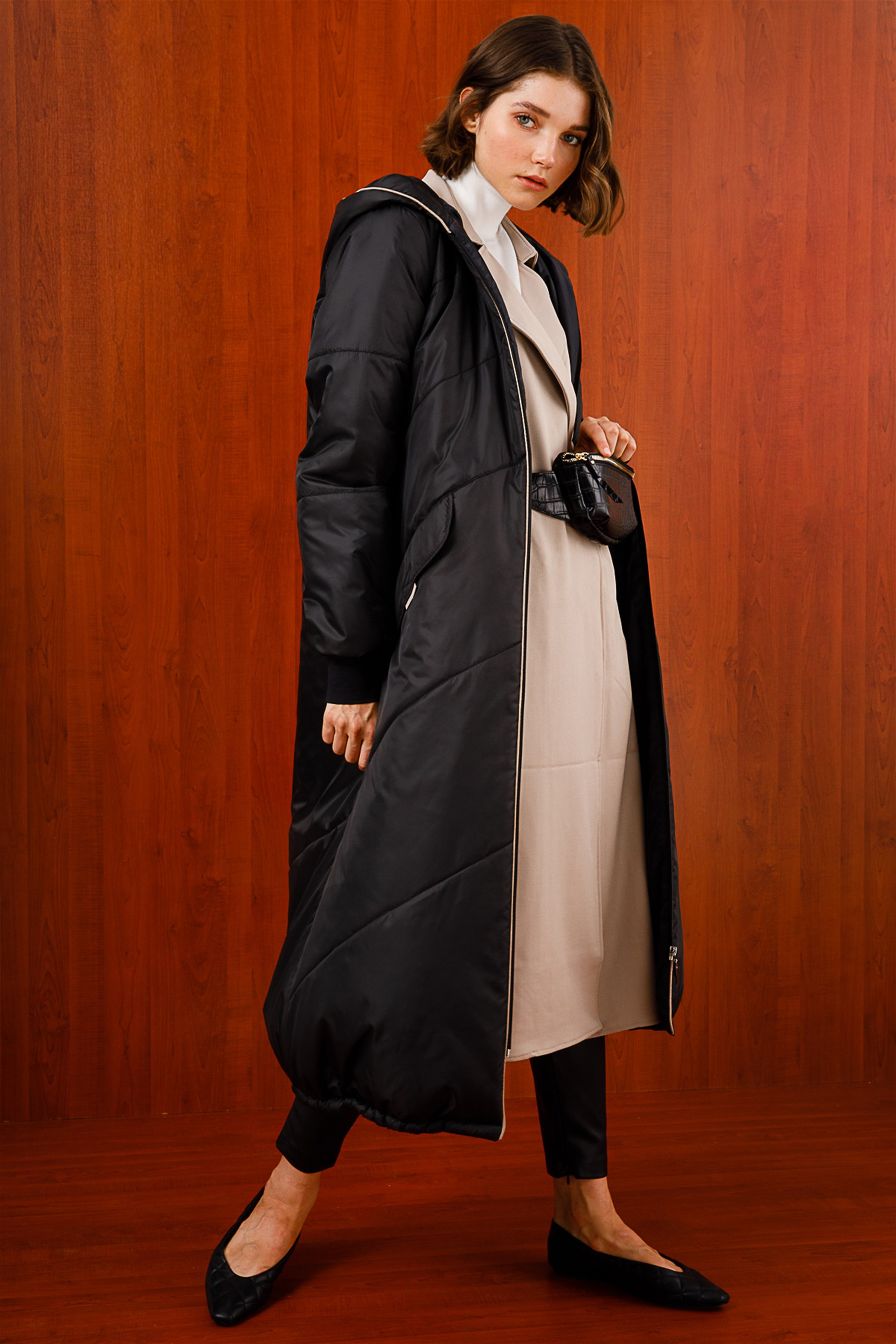 Sportif Biye Detaylı Dokuma Şişme Tam Boy Manto-Siyah