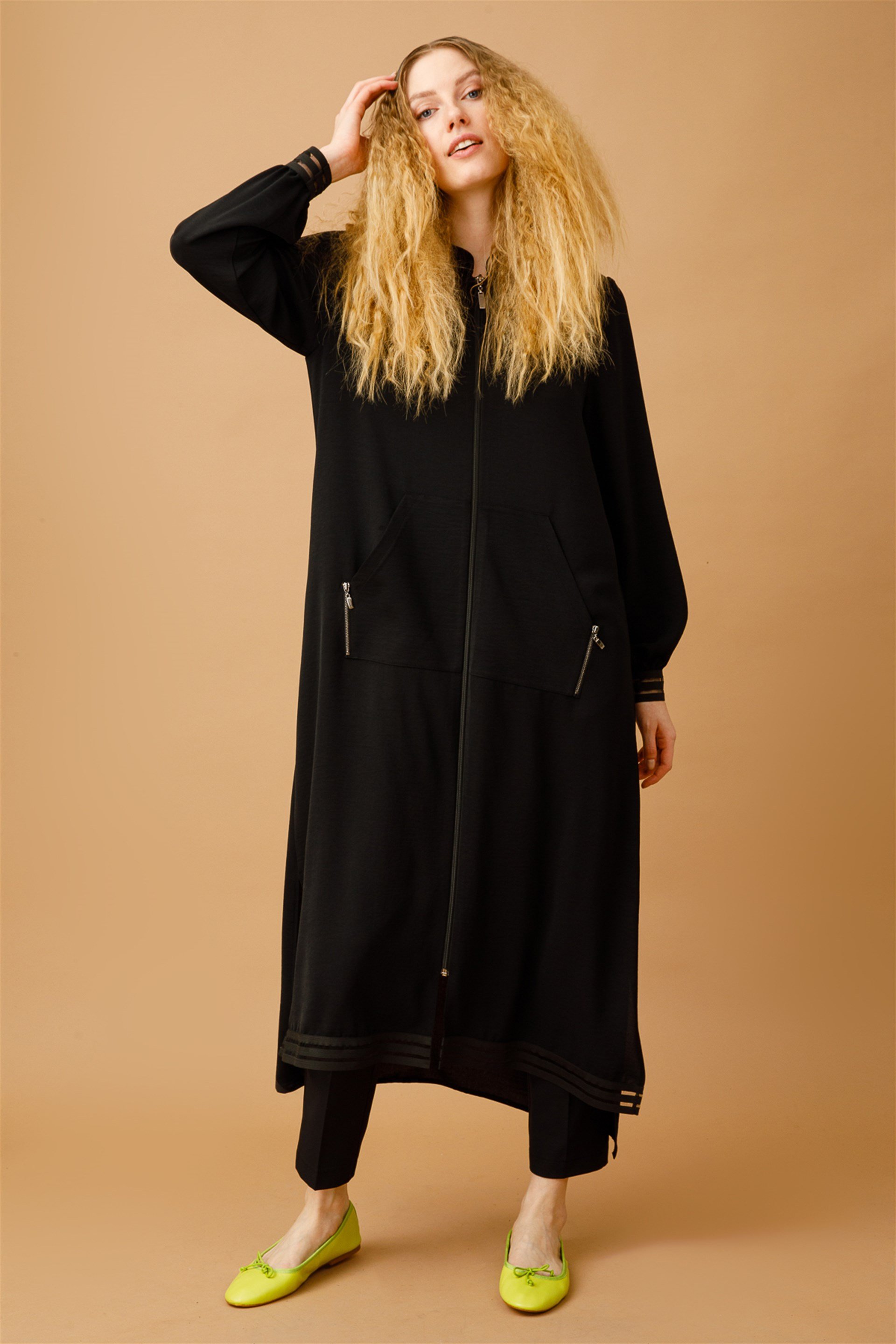Sweet Önde Cep Detaylı Kolları Lastik Ribanalı Spor Tam Boy Kap-Siyah (221816M PARDESÜ-01)