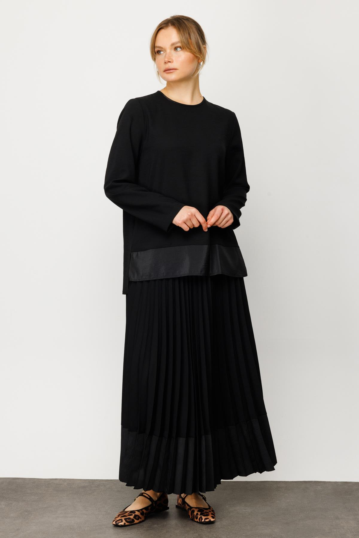 Tafta Bant Detaylı Pilise Etekli Alt Üst Takım-Siyah (231802M TAKIM-01)