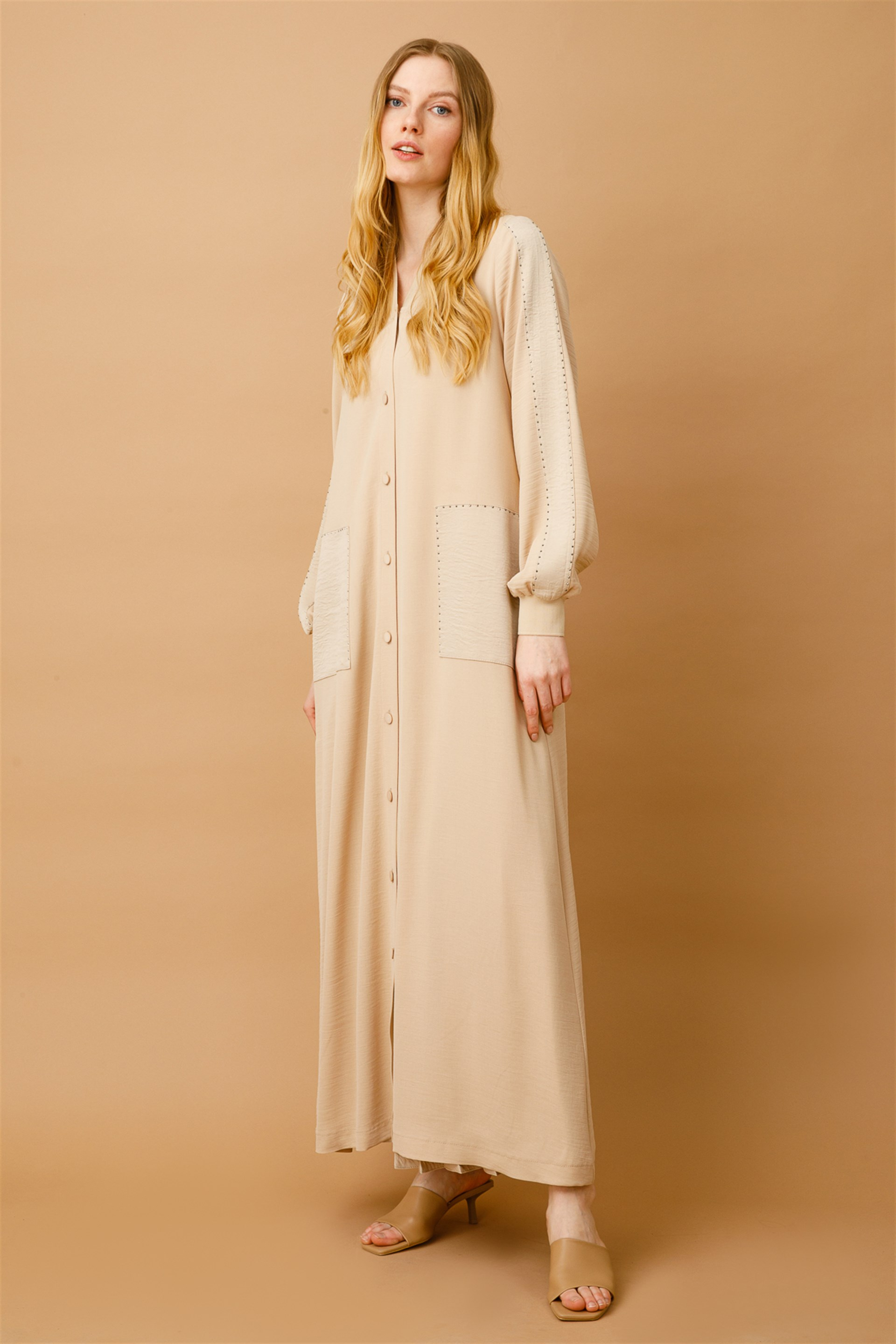 Trok Garni Aksesuarlı Yakası ve Kolları Ribanalı Spor Tam Boy Kap Ferace-Taş (221509M PARDESÜ-12)