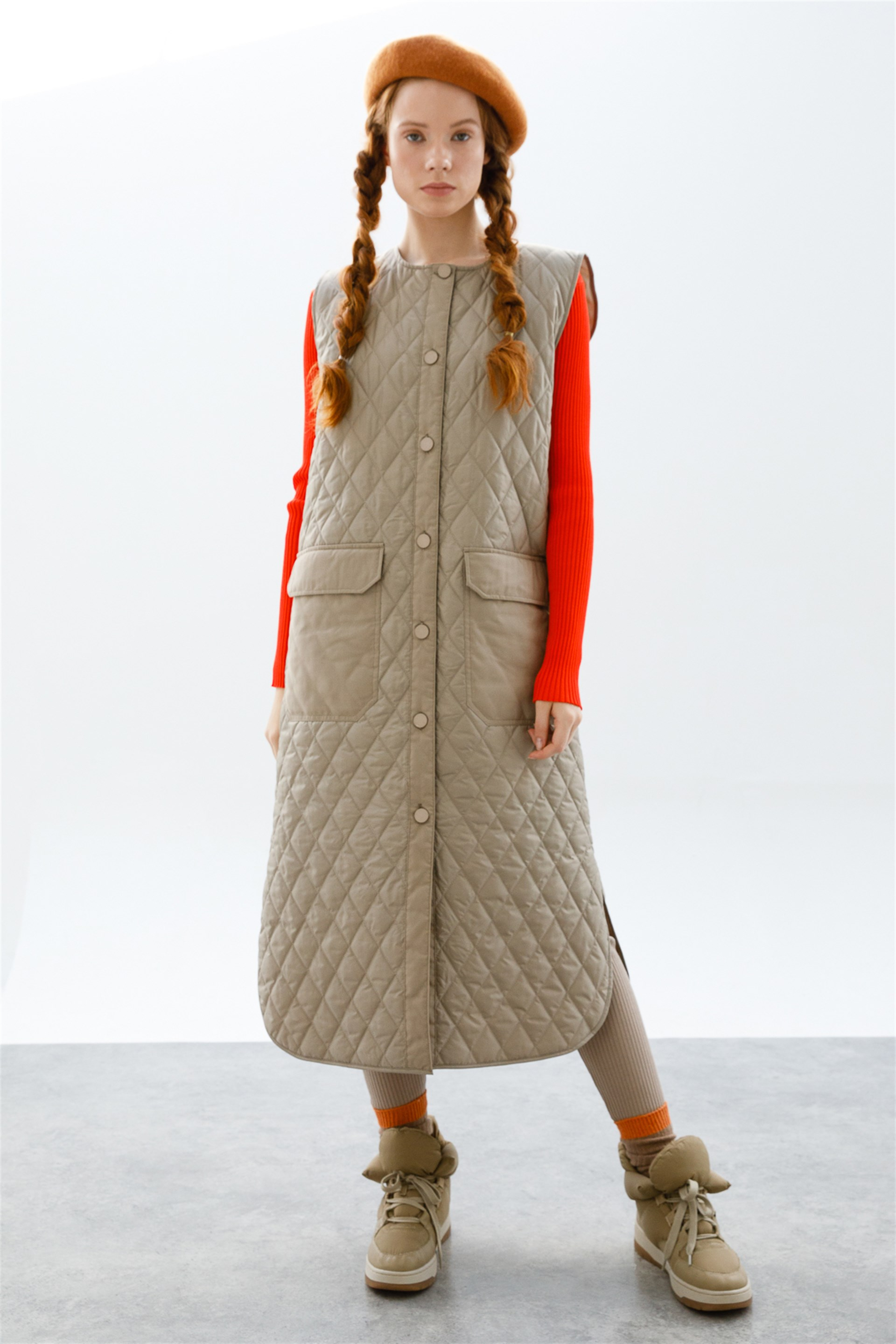 Uzun Helene Garni Detaylı Timeless Kapitone Yelek-Taş (222701M YELEK-12)