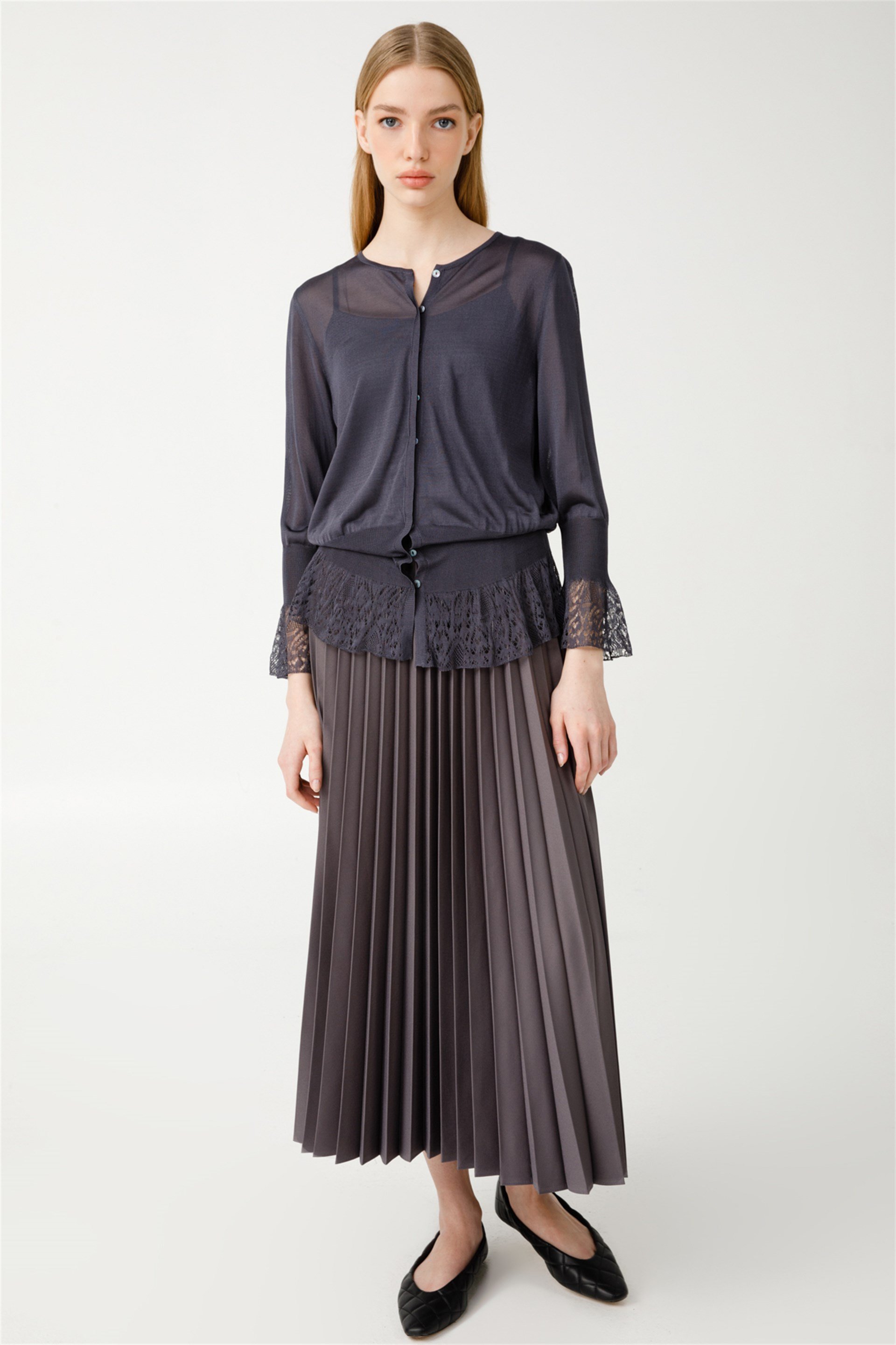 Vazgeçilmez Piliseli Beli Lastikli Tam Boy Etek-Gri (221206M ETEK-18)