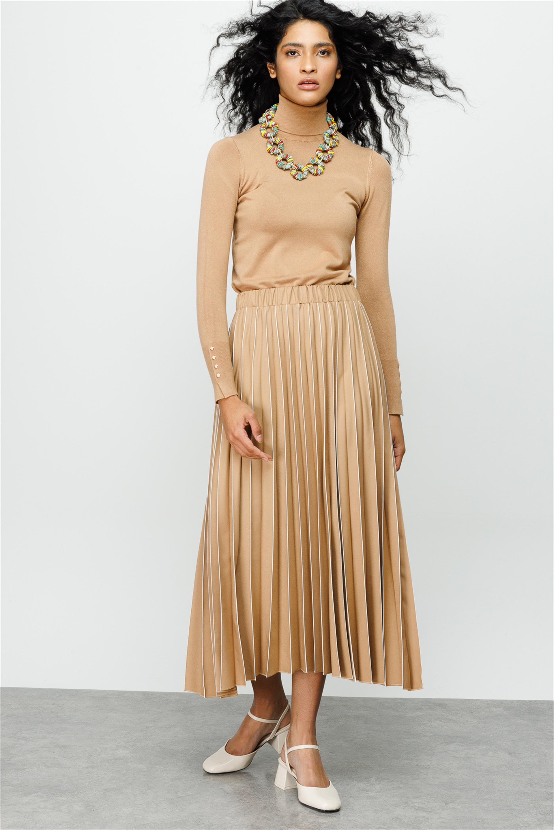 Vouge Özel Pilise Detaylı Lastikli Etek-Camel (231206M ETEK-08)