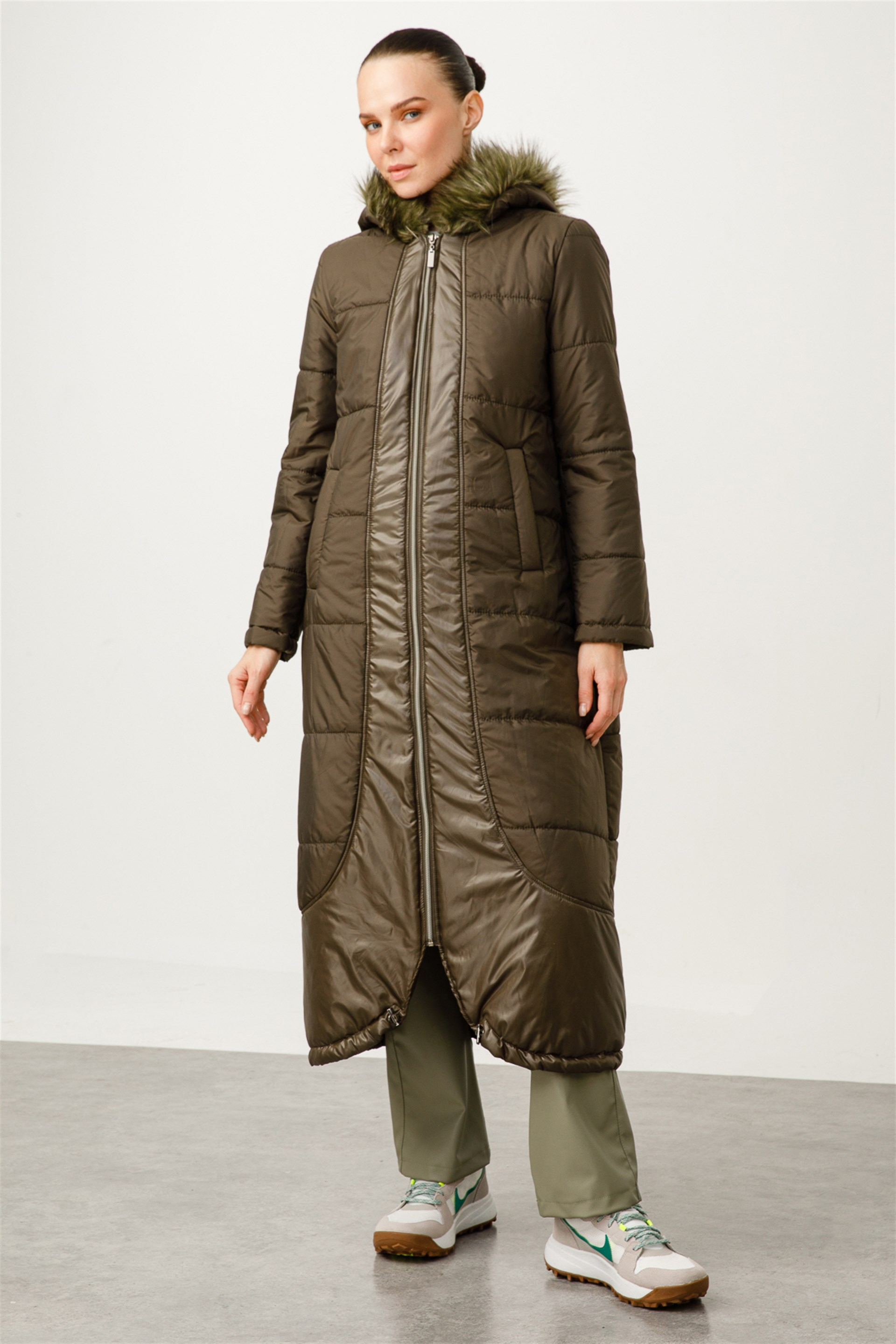 Wolf Kürklü Kapitone Şişme Manto-Haki
