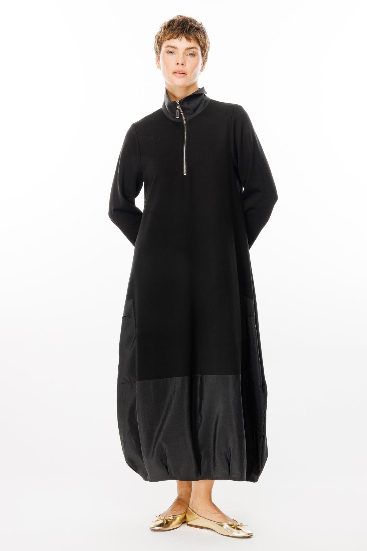 Yaka Fermuar ve Etek Turu Garni Detaylı Tam Boy Zamansız Elbise-Siyah (242310M ELBİSE-01)