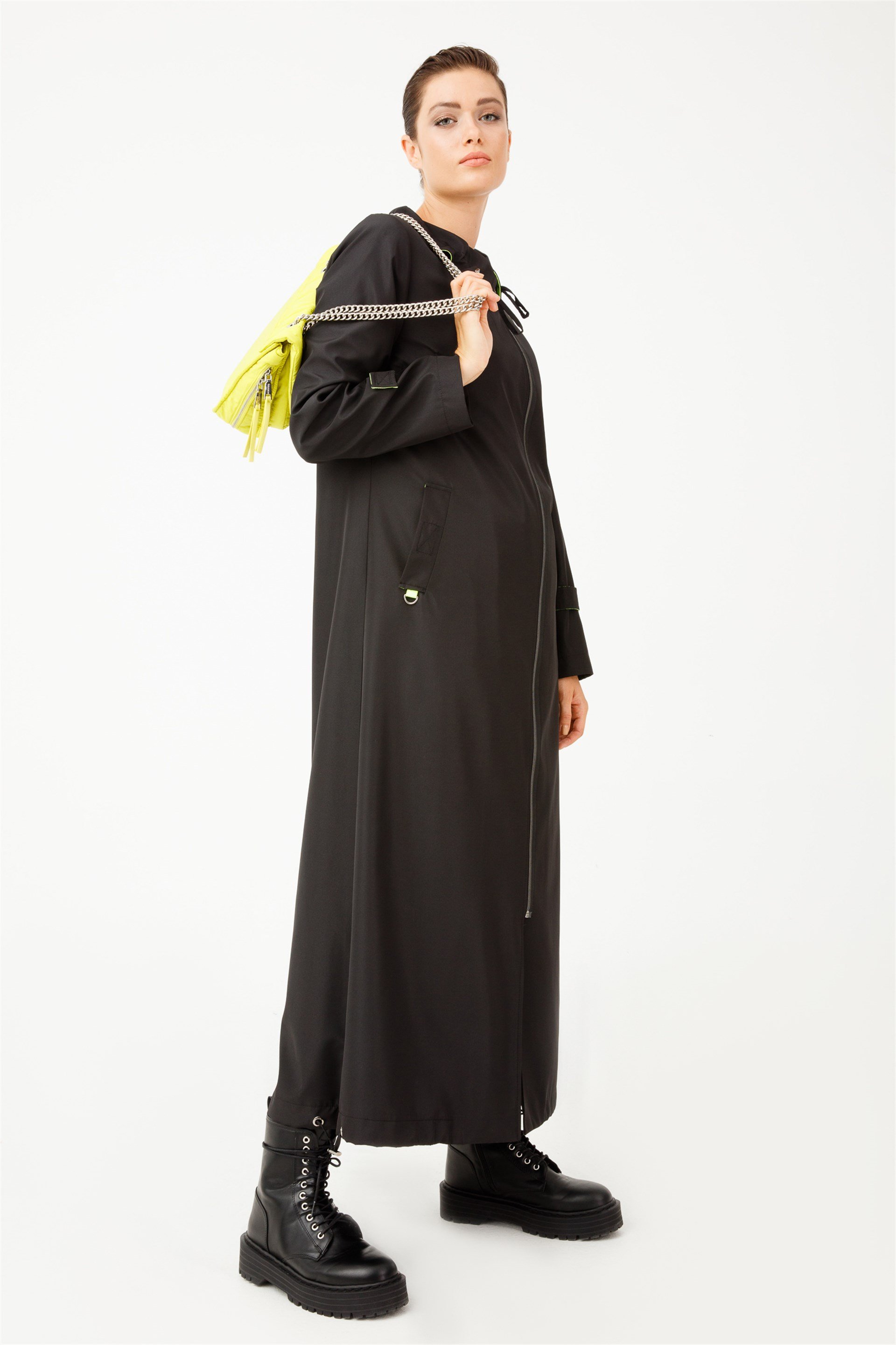 Yakası Büzgü Detaylı Neon Garnili Anvelop Kapama Pardesü-Siyah (202532M PARDESÜ-01)