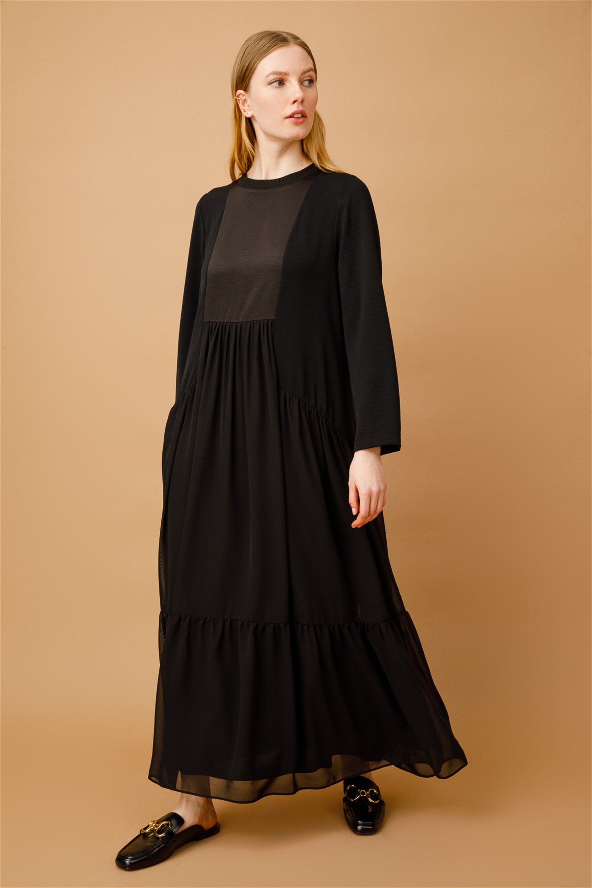 Yakası Ribanalı Şifon Saten ve Nefes Alan Zor Kırışan Kumaşın Uyumu ile Tam Boy Elbise-Siyah (221305M ELBİSE-01)