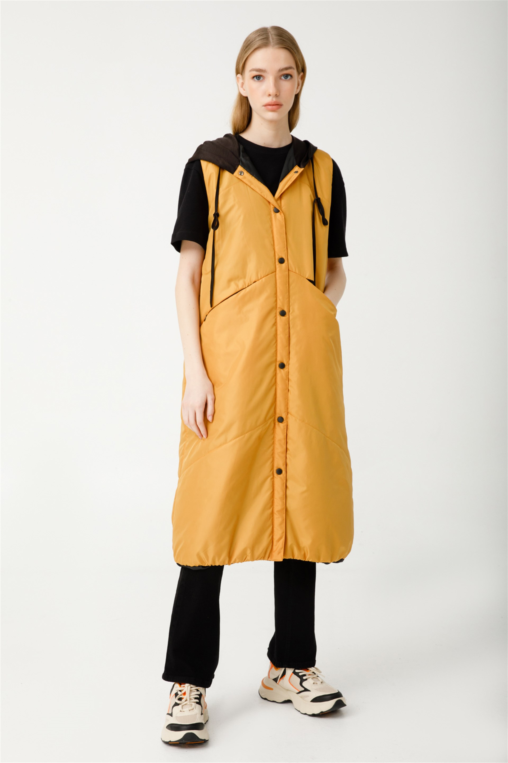 Zıt Çıtçıt ve Kapüşon Detaylı Baharlık Rüzgar Geçirmez Kapitone Yelek-Hardal (221710M YELEK-84)