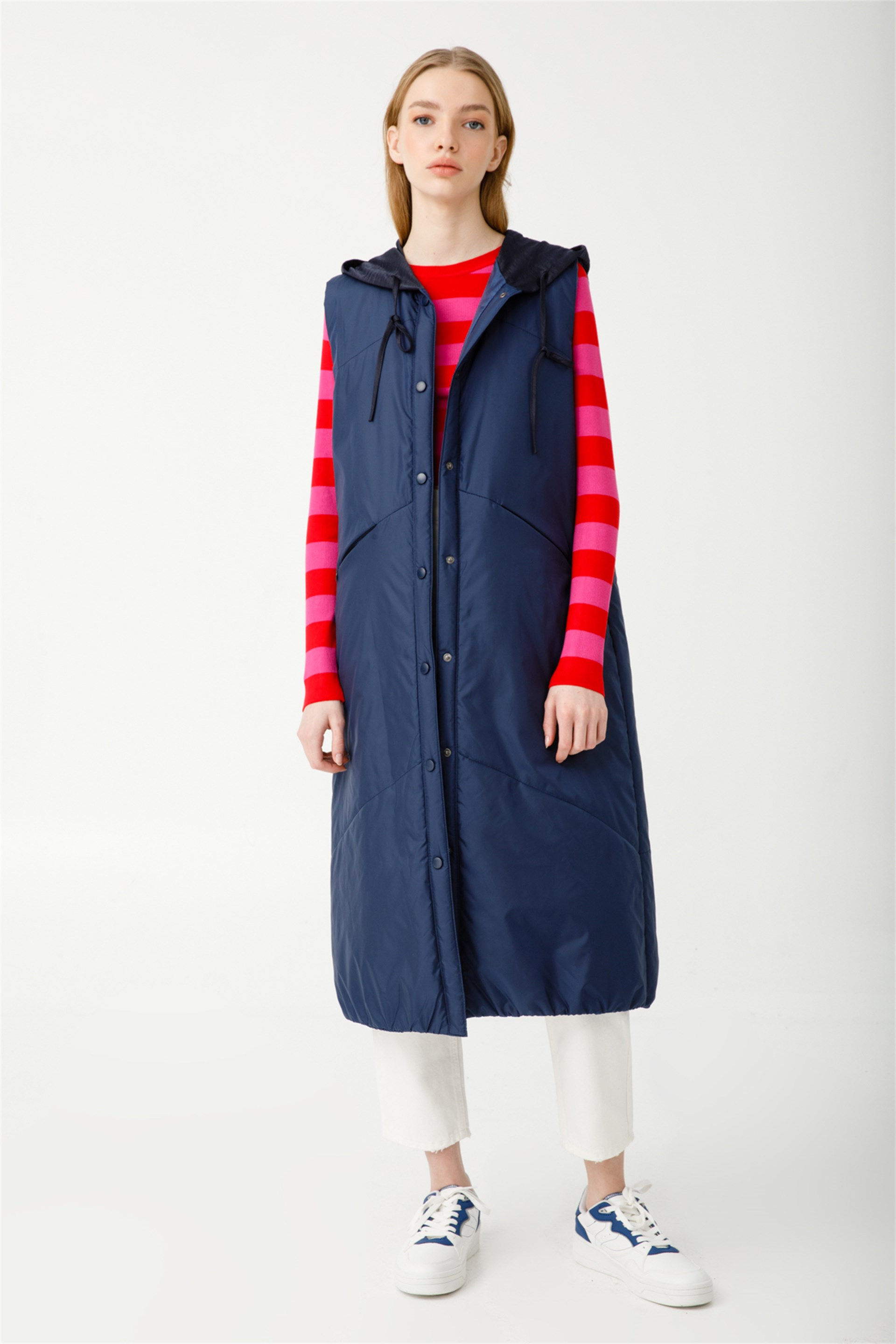 Zıt Çıtçıt ve Kapüşon Detaylı Baharlık Rüzgar Geçirmez Kapitone Yelek Üretim Ülkesi: Türkiye Sezon: 2022 İlkbahar Yaz Kumaş İçeriği: %100 Polyester Boy Uzunluğu: 114 cm Ürün Ölçüleri 38 Beden için: Göğüs 104 cm, Bel 106 cm, Basen 118 cm Bedenler arası 5 cm fark etmektedir. Manken Ölçüleri Giydiği Beden: 36 Boy: 175 cm Göğüs: 75 cm , Bel: 60 cm , Basen: 88 cm