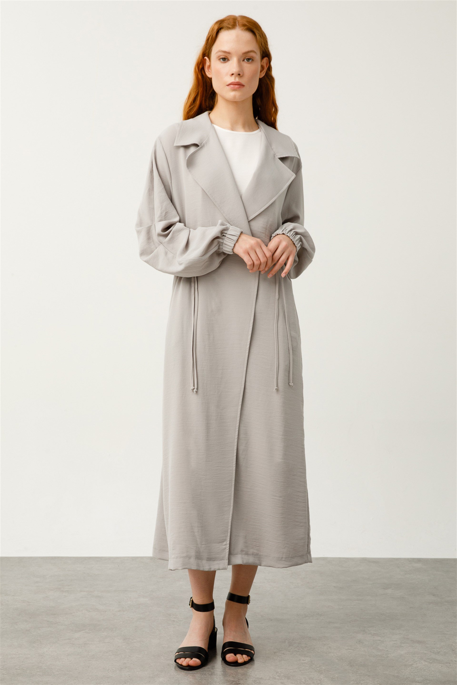 Zor Kırışan Kumaştan Kolları Pile Detaylı Hafif Trençkot-Gri