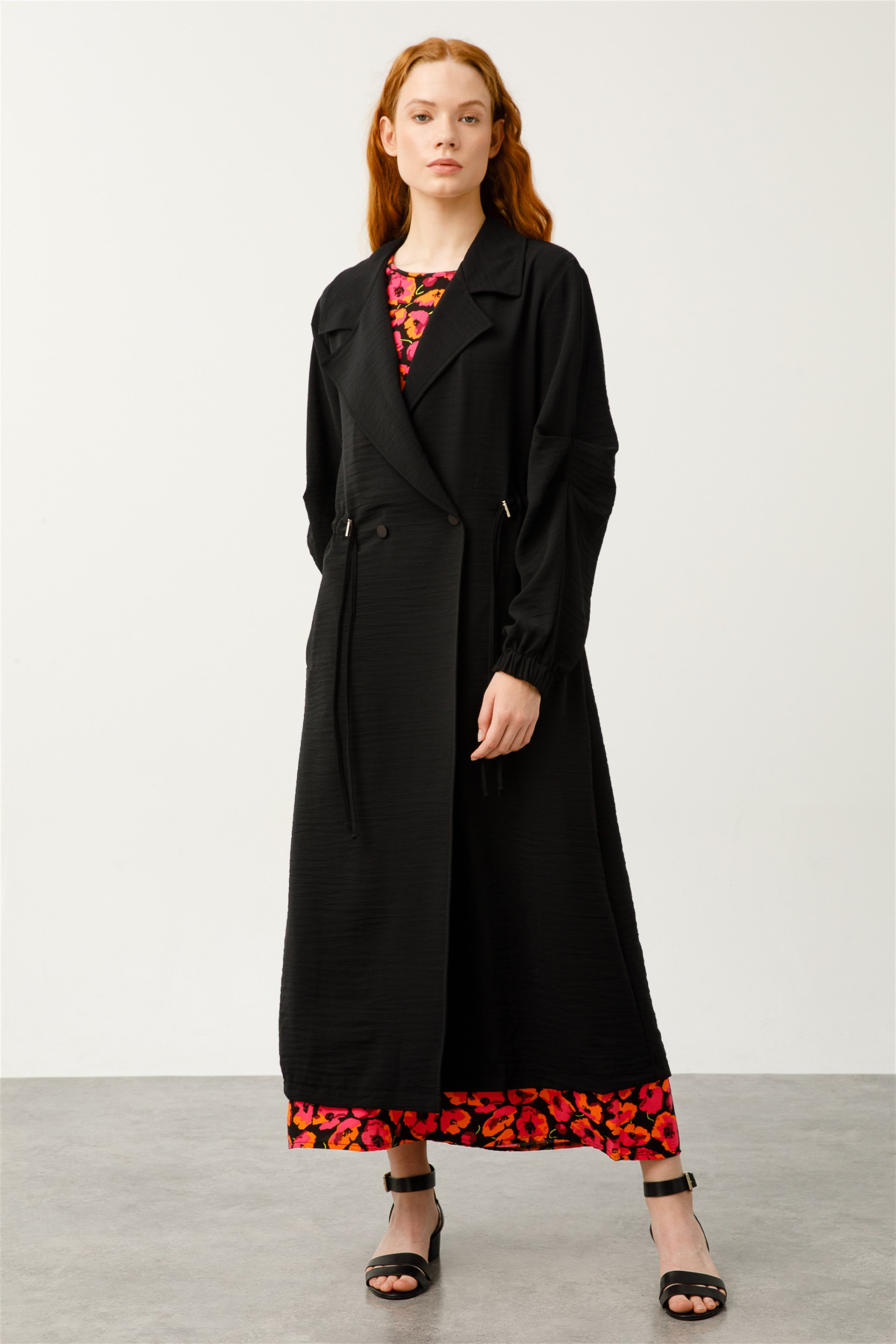 Zor Kırışan Kumaştan Kolları Pile Detaylı Hafif Trençkot-Siyah