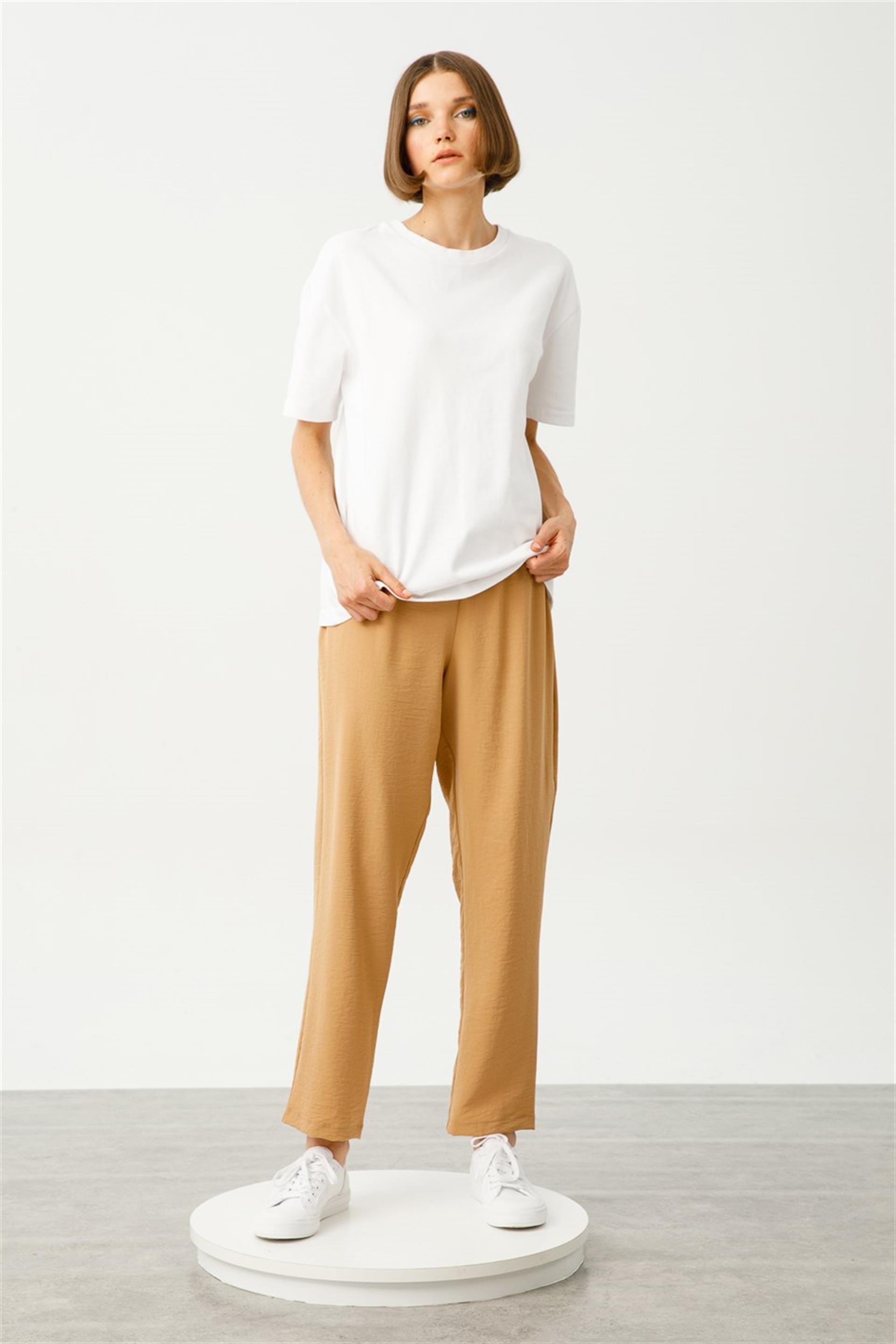 Zor Kırışan ve Nefes Alan Kumaştan Beli Lastikli Havuç Pantolon-Camel (231905M PANTOLON-08)