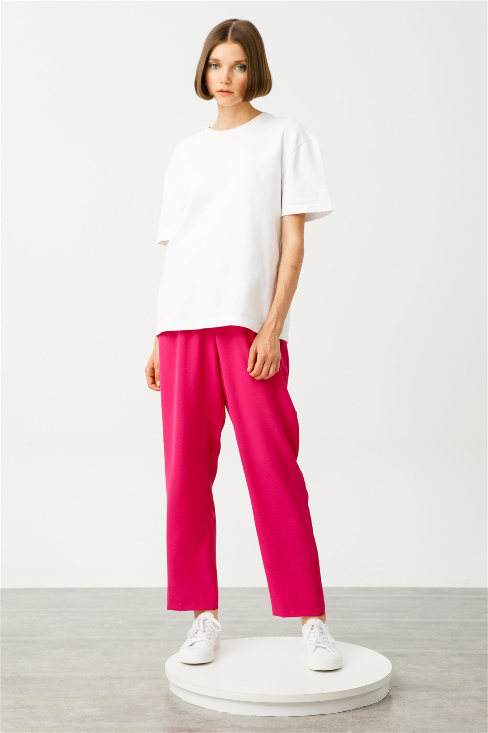 Zor Kırışan ve Nefes Alan Kumaştan Beli Lastikli Havuç Pantolon-Fuşya (231905M PANTOLON-25)
