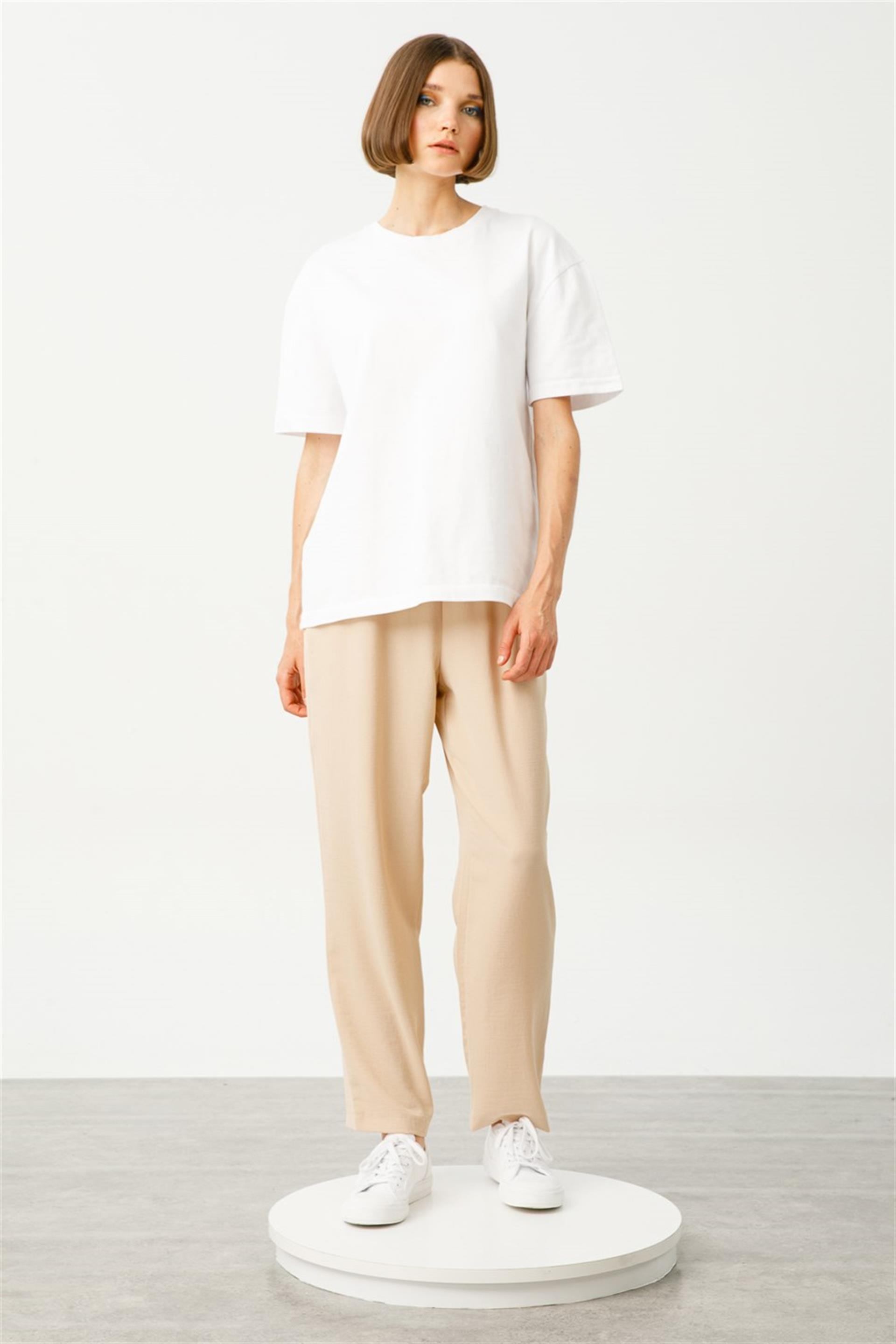 Zor Kırışan ve Nefes Alan Kumaştan Beli Lastikli Havuç Pantolon-Taş (231905M PANTOLON-12)